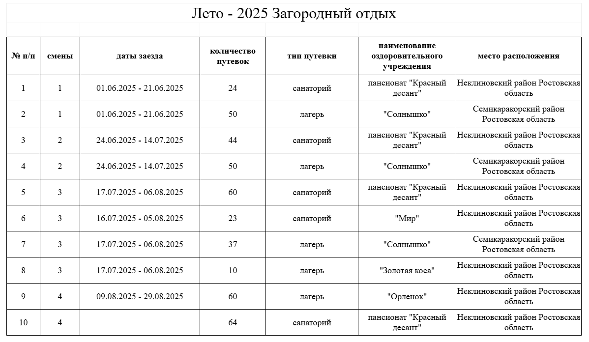 В летнее время есть возможность провести каникулы в лагере или санатории. Информация о сменах, месте и количестве путёвок в таблице.